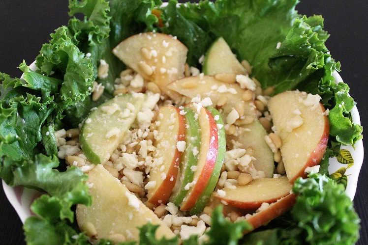 In a large mixing bowl, add theĀ apples, lettuce, nuts, and the crumbled feta cheese. Pour the dressing on the salad and toss lightly.