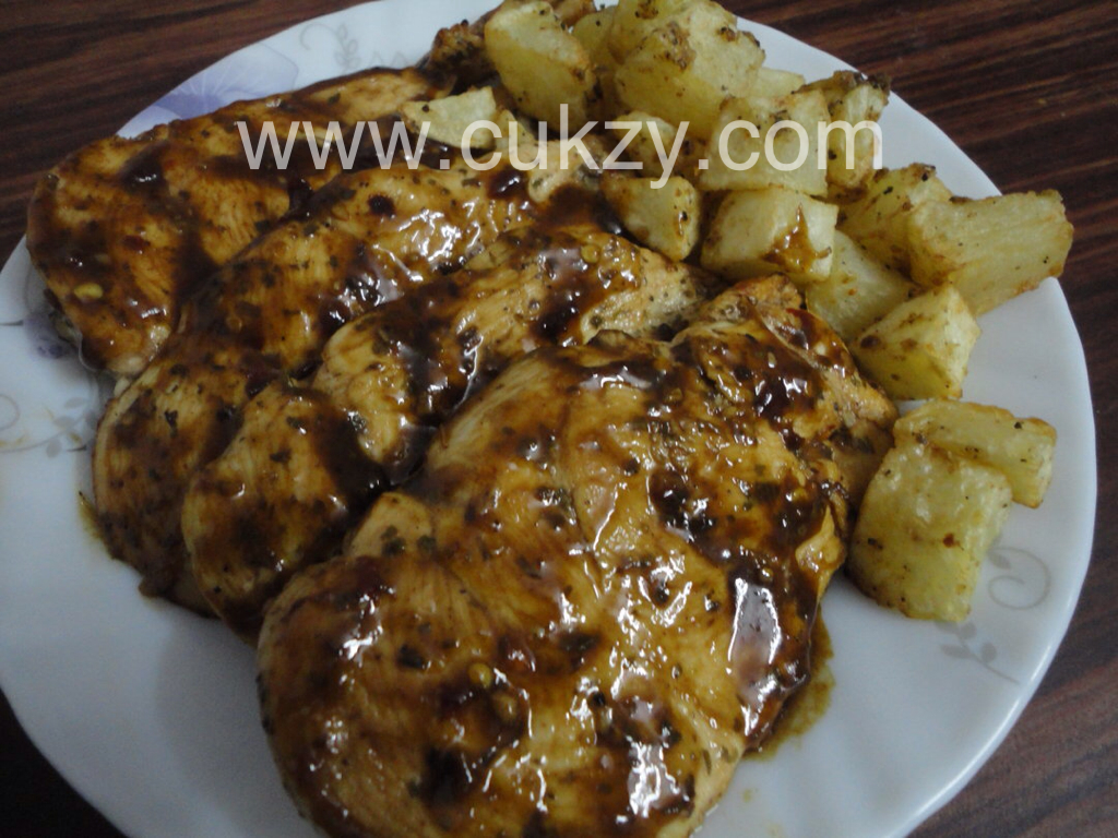 Serve the chicken on a platter. Glaze the chicken by pouring the sauce over it. I served it with some crispy potatoes.