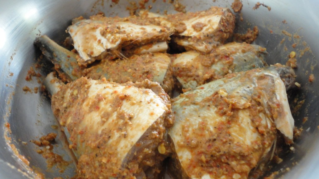 3. Slit the fish pieces sideways and stuff in a teaspoon of paste. Marinate the fish pieces with the remaining paste for about one hour.