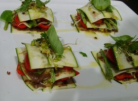 5. Spread the paste on the zucchini sheets and on the bell pepper sheets. Build layers of the vegetables to a lasagna style presentation, and top it with basil or other herbs for garnish.