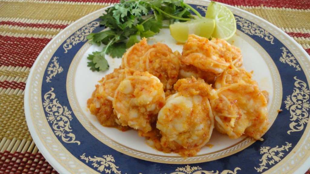 Butter Garlic Prawns are a favorite with seafood lovers, mostly because of their strong, arresting aroma. Butter garlic prawns originally are low on spice levels. I came up with this prawns recipe to serve my folks butter garlic prawns that are mildly spiced. The onion and the chillies are processed into a paste so as to not overpower the flavour and fragrance of the butter and the garlic. This easy prawns recipe take about 20 minutes on the clock, and is a wonderful dish to present.