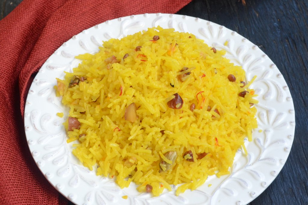 Zarda Pulao is also known as Zafraani Zarda Pulao (Sweet Saffron Rice). The dish is not really a dessert but more like a finishing touch to your main course. Zarda pulao has been a mandatory dish to finish the Friday lunch (Compulsory congregation prayers are offered on Fridays). In my family, the Friday menu has been a tradition – plain rice, dal gosht, and zarda pulao. It definitely has a special place on the Eid menu too (Try Cukzy’s Eid Recipes)! Adding milk, khoya, or pineapple are optional. I personally like it with diced pineapples 🙂